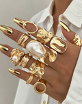 Elevate your style with this asymmetric pearl flower ring set, featuring geometric designs, hollow round shapes, and multi-layer metal textures. Perfect for adding a touch of rugged chic elegance to holidays, parties, dates, or everyday wear.